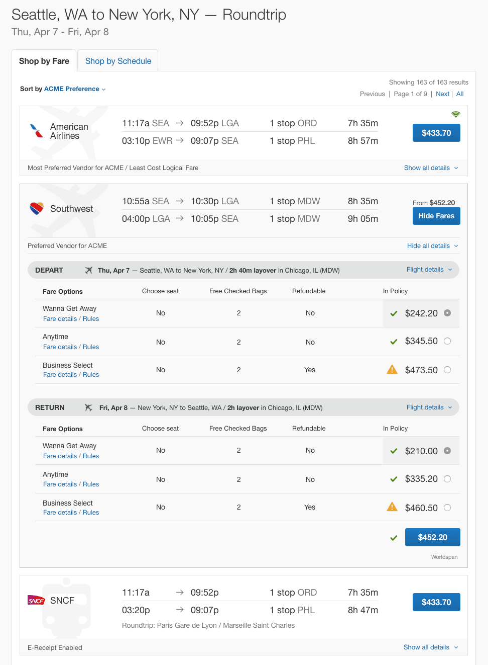 AFTER: I eliminated complexity and used progressive disclosure to prioritize information critical to booking in alignment with corporate policy and traveler needs.